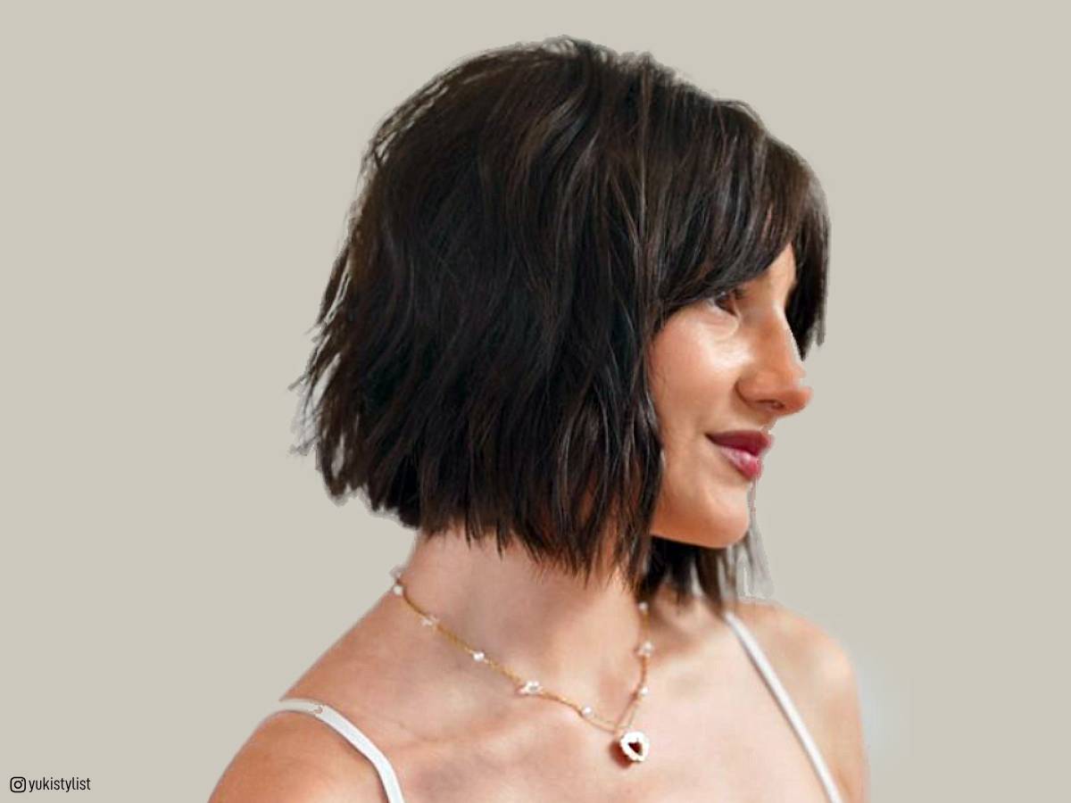 A layered choppy bob with fringe haircut suits most face shapes. Playing with the overall length of the choppy hair will help accentuate your desired features and shape. When it comes to layered hairstyles, having those ends textured with a razor, point cutting, or slicing out some internal weight will give you the perfect hairstyle.