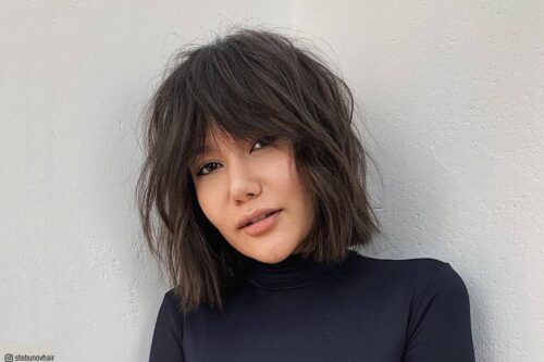 To give your locks a new body and shape, here’s a short shag with bangs you should try! Feel free to style it with texture to bring out a lot of movement to your thick brown hair. To frame your face, opt for choppy bangs and a length that’s near your collarbone.